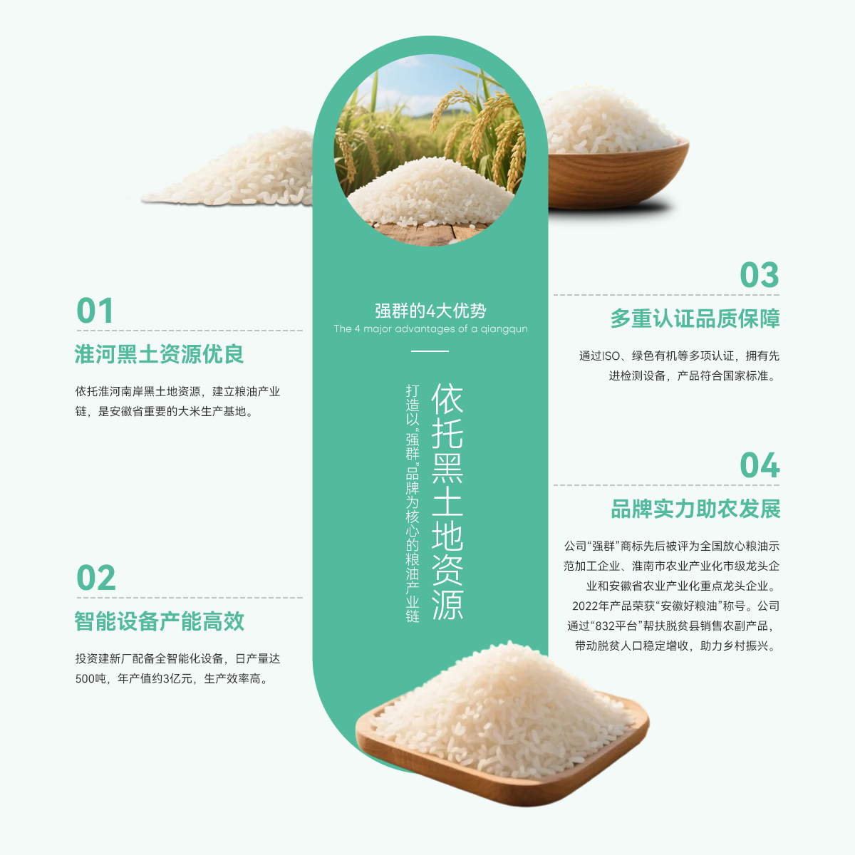 - 壽縣強群糧油貿易有限公司成立于2011年,座落在淮南市壽縣澗溝鎮(zhèn),是一家集種植、加工、收儲、銷售于一體、以生產中、高檔質優(yōu)、特色類大米為主的綜合性企業(yè)。公司依托準河南岸的黑土地資源,打造以“強群”品牌為核心的糧油產業(yè)鏈,是安徽省重要的大米生產基地。 為響應市場增長需求,公司2021年啟動二期擴產工程,其中新生產廠區(qū)建設投入資金近億元,建設現代化新生產線,總占地面積約4000...